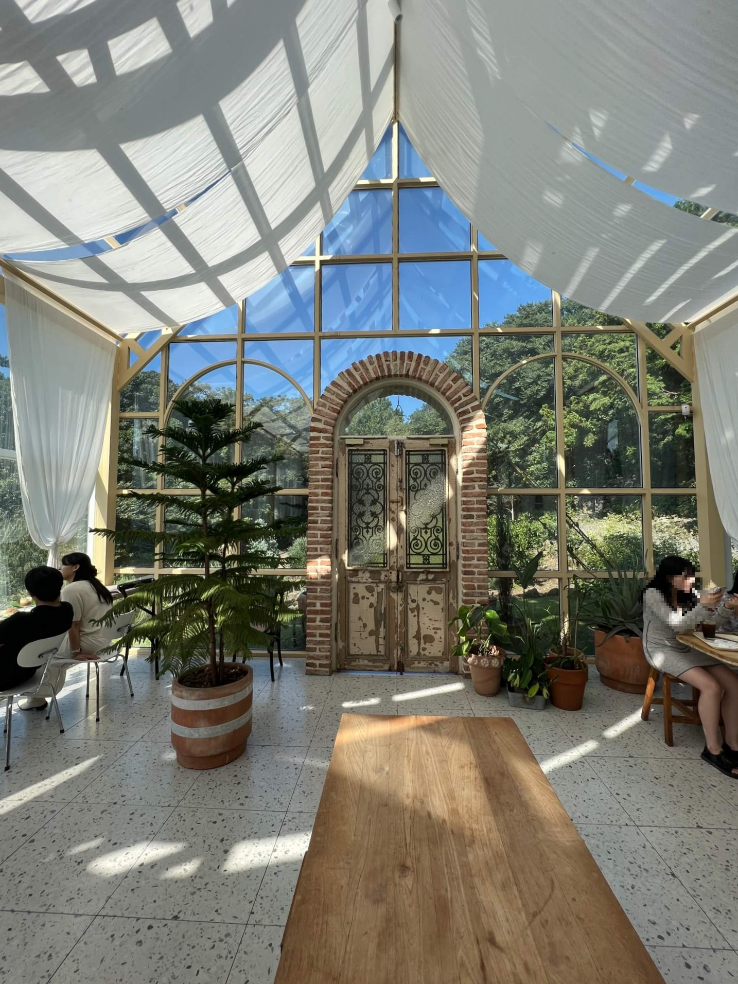 온실 속 공간은 대부분이 유리로 되어 있어 햇살을 많이 받습니다. 늘 밝고 환해서 좋고 비가 오는 날은 더욱 운치 있어 어떠한 변화에도 다채로운 모습을 볼 수 있어 좋답니다. 별도로 대관을 해주기도 하는 것 같은데요. 스몰웨딩이나 웨딩촬영 등을 할 수 있는 공간인듯합니다.