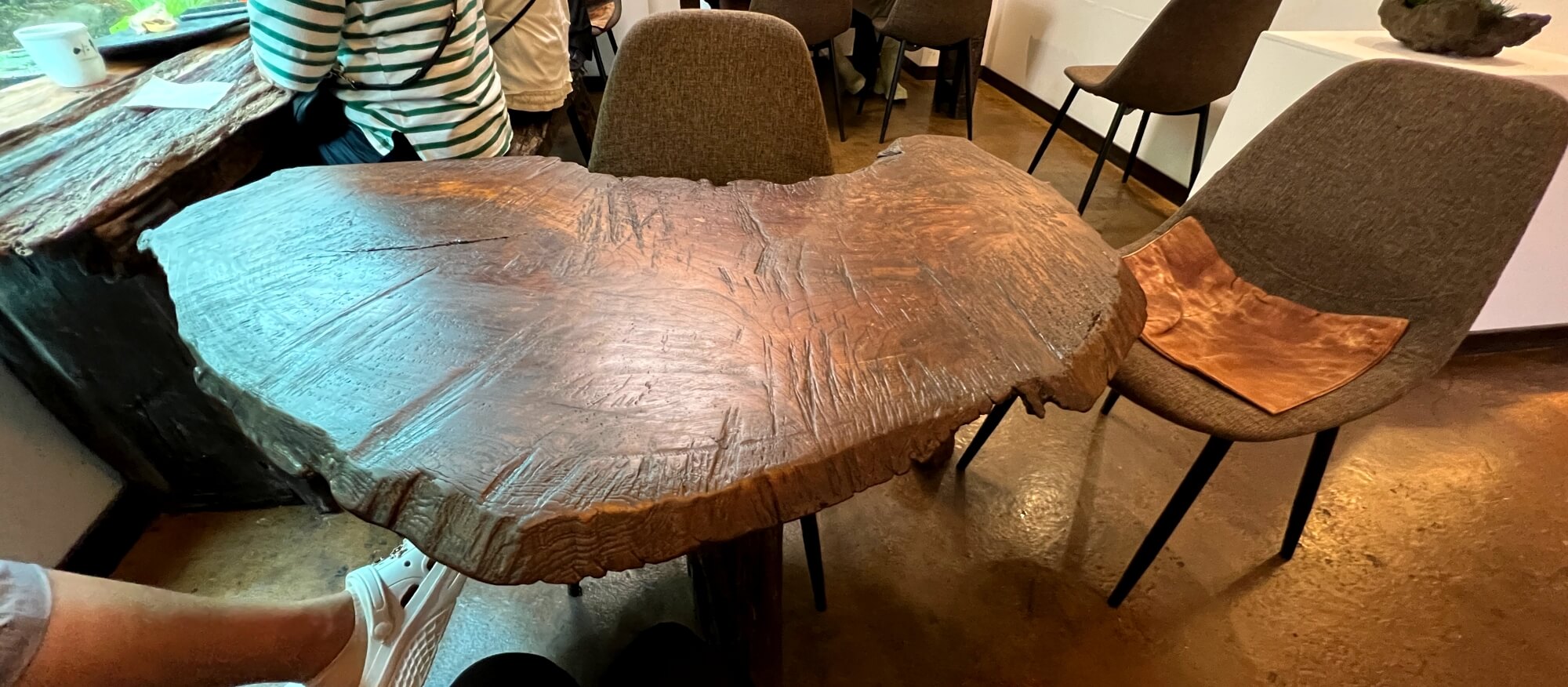 저희가 먼저 자리한 곳은 바깥쪽에 새로 만들어진 곳이었습니다. 자리가 없었거든요. 우선 자리를 하고 안쪽을 기웃거리며 자리가 나는 것을 기다리고 있었습니다. 통으로 잘려진 이 넓은 상판의 테이블은 보기만해도 멋스러운 작품같아 보였습니다.