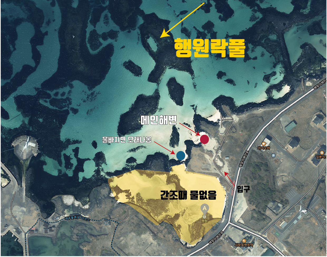 코난해변 행원해변은 만조일때 해변이 거의 잠수입니다. 메인 공간 조금 남아있을 정도여서 자리를 잘 잡아야 됩니다. 하지만 물때를 잘 맞추면 어느 공간이든 편하게 즐기다 오실 수 있습니다. 여름철인 7~8월엔 주로 낮에 물이 많이 빠져 있어서 물놀이에 안성맞춤입니다. 메인해변 공간이 워낙 작긴해서 주변 공간도 많이들 이용하시는데요. 파란색 점 공간이 서브 해변으로 아담하니 좋습니다. 주로 제가 파라솔치고 즐기는 공간입니다. 사람도 덜 북적거리고 여유있어요.