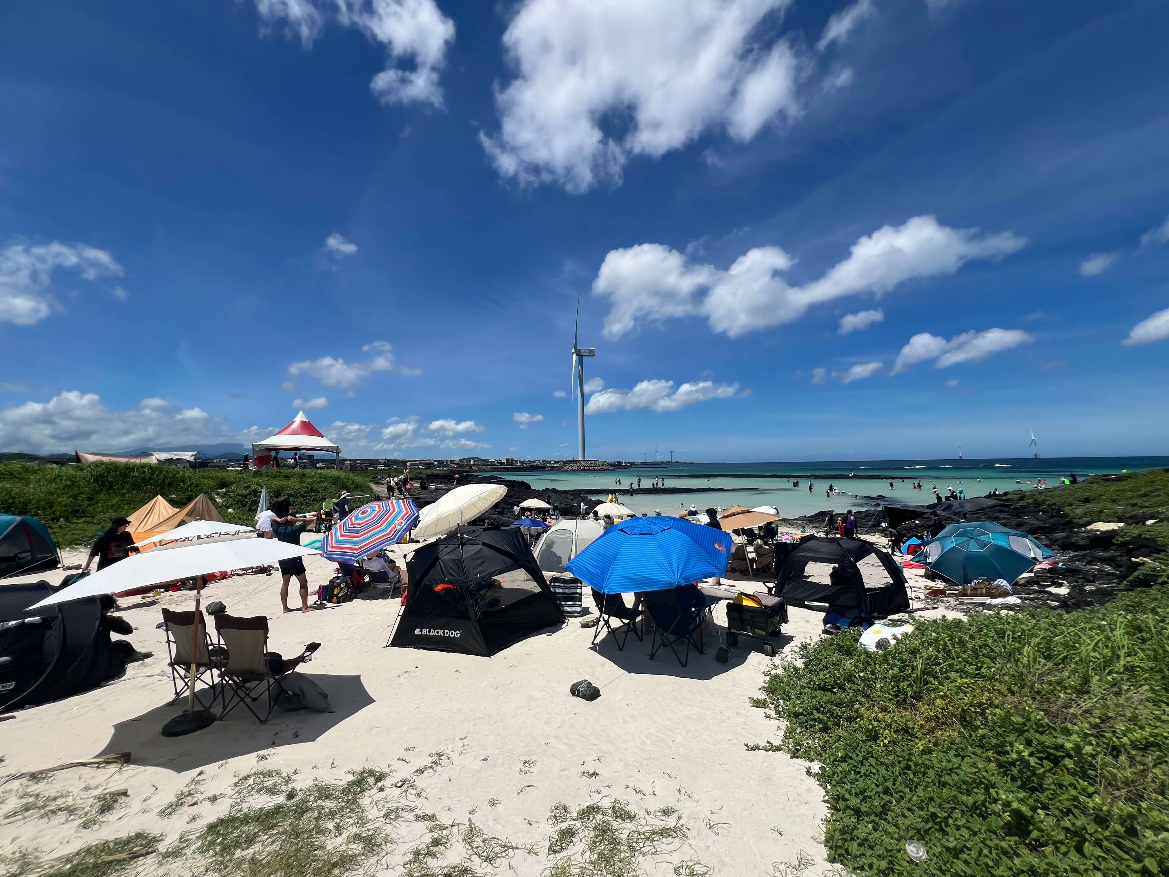 작년에 한참 유행하던 인디언 파라솔이 올해는 안보이네요. 제주는 바람이 많이 불어서 좀 강력한 텐트를 들고 다니셔야 합니다. 오늘도 바람이 많이 불고 있어요. 텐트를 모래에 설치할 때도 좀 깊게 파야하고 그렇지 않을 경우에는 돌을 가져다 무겁게 고정을 시켜야 합니다. 바람에 날아가니 꼭 염두해두시고 설치하세요!
