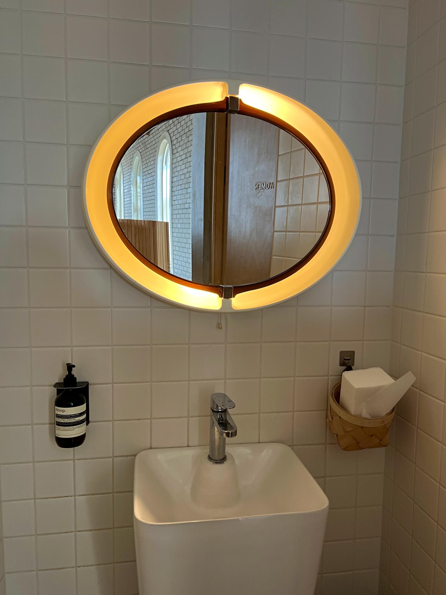 화장실 입구에 세면대만 담아봤어요. 조명과 거울이 독특하고 예쁘죠.