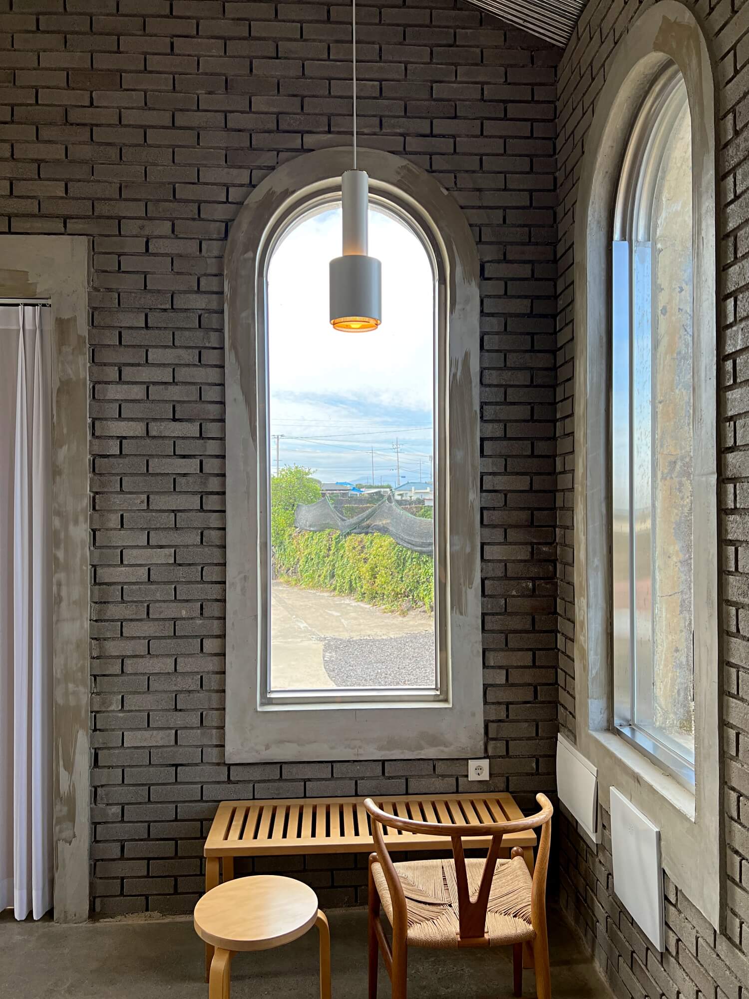 입구 오른쪽으로 화장실이 있고 그 옆으로 가장 큰 통유리로 창밖이 보이는 멋진뷰가 눈에 들어왔습니다. 뷰도 뷰지만 제가 유일하게 알고 있는 루이스폴센 조명이 메달려 있었어요. 사실 이곳의 공간은 조명이 가장 먼저 눈에 들어옵니다. 제가 조명을 좋아하는 탓일까요? 가구보다는 조명을 먼저 보게 됩니다.