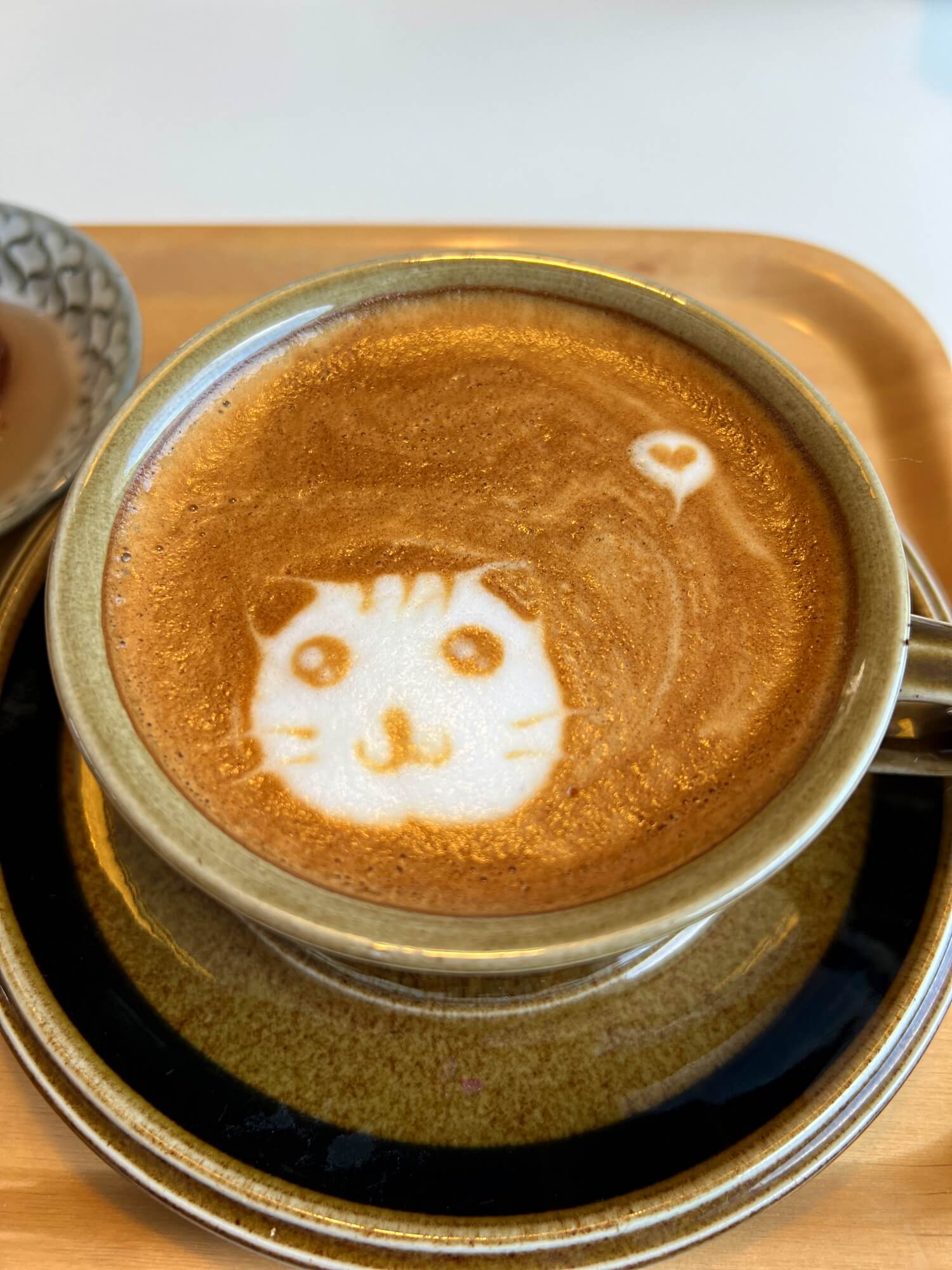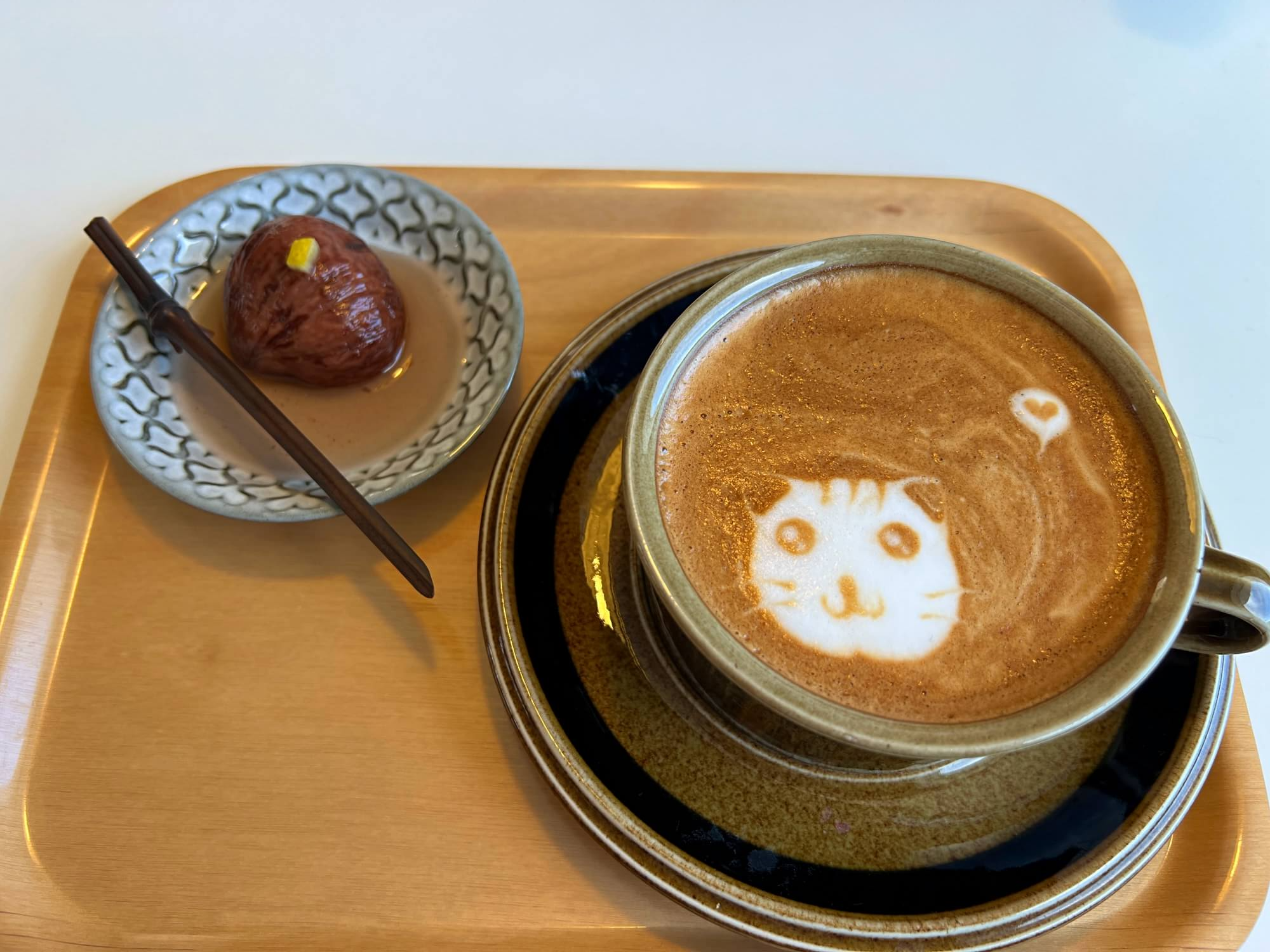 커피가 나왔는데 어쩜이리 예쁜 고양이 한마리를 그려주셨는지, 이날은 고양이의 의미를 잘 몰랐지만 나중에 알고보니 '치즈태비'라는 뜻이 치즈색깔 줄무늬 고양이라네요. 그렇게 듣고 보니 고양이 한마리가 커피안에 예쁘게 앉아서 바라보는 모양입니다. 특별서비스로 밤디저트를 주셨네요!