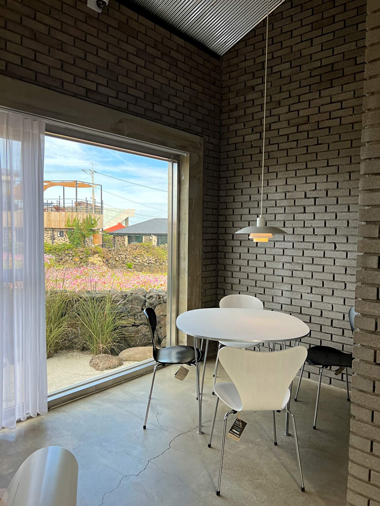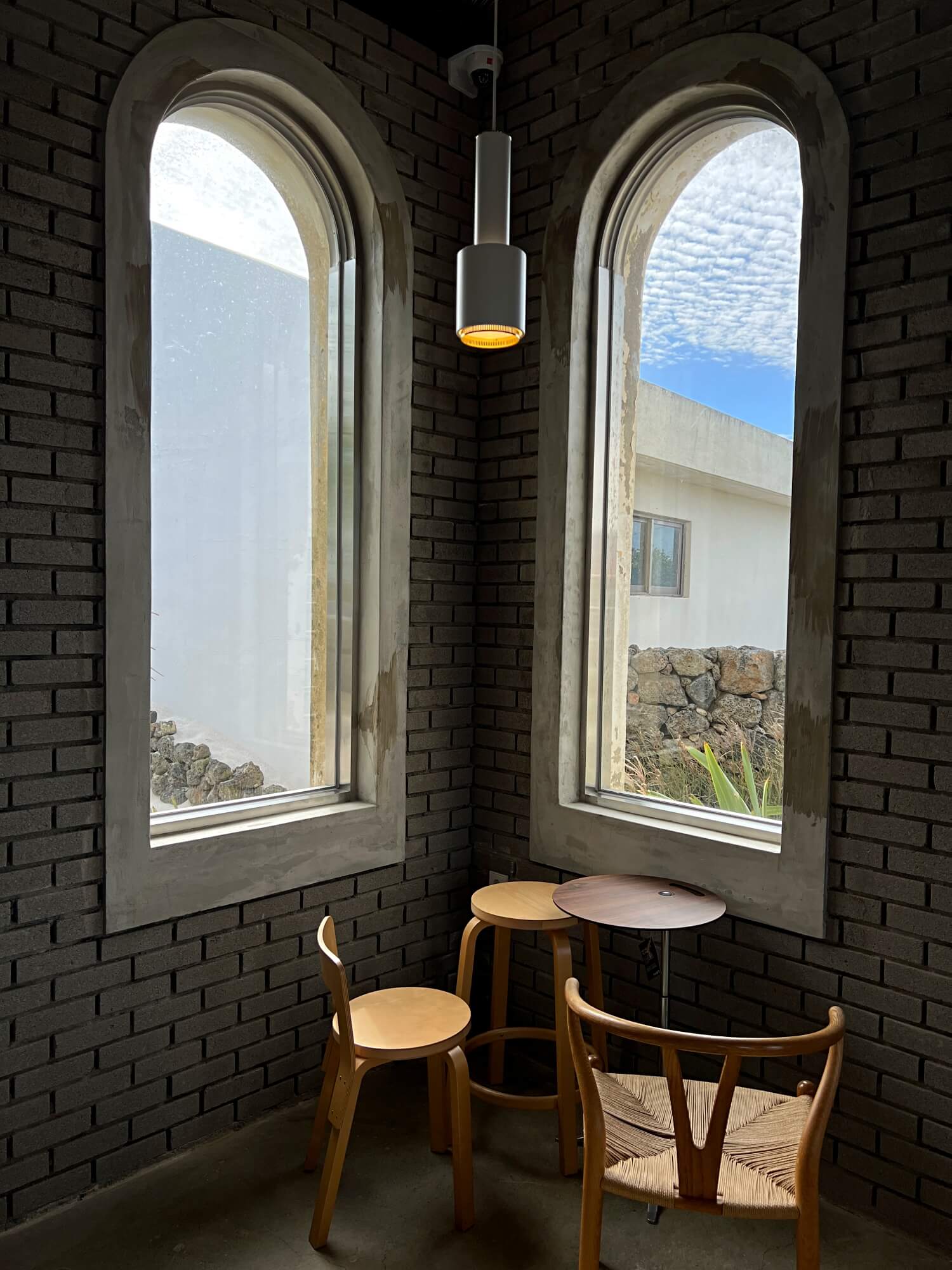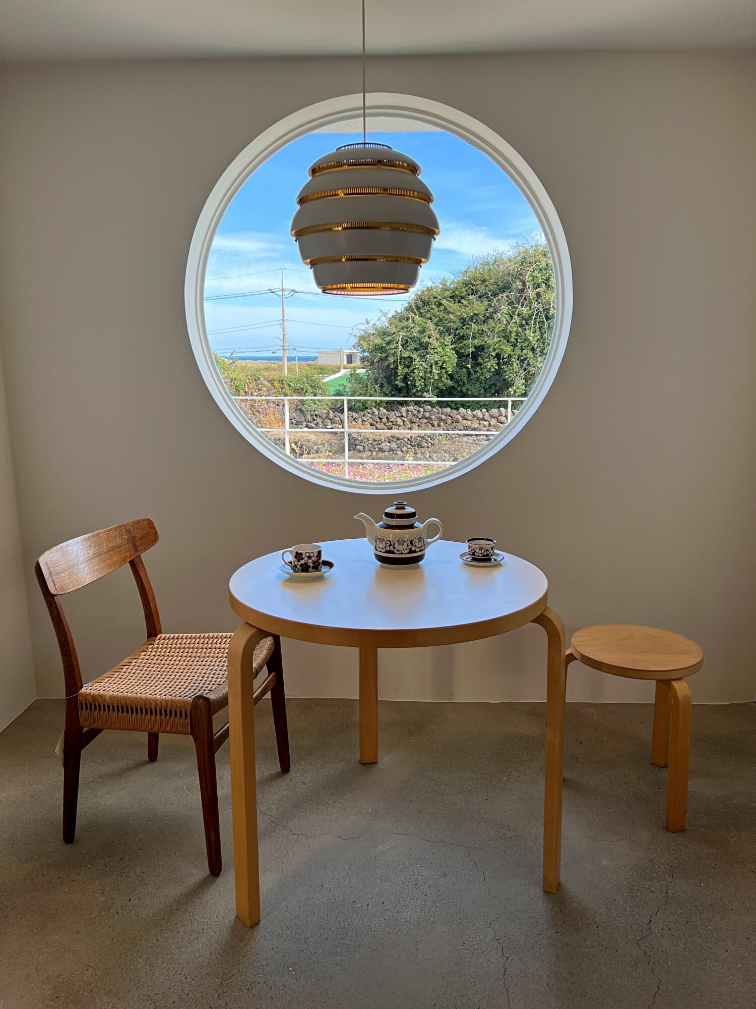 현관문을 열고 들어서면 정면을 보이는 원형의 통창문과 그 밖으로 보이는 바다와 돌담 그리고 꽃밭은 제주에서만 느낄 수 있는 제주스러움이 가득했습니다. 거기에 고급진 조명은 한껏 분위기를 내주었어요. 바로 오른쪽으로는 주문테이블과 음료를 만드는 곳이었는데 필요한 모든 것이 있음에도 굉장히 심플함이 느껴지는 공간이었습니다.