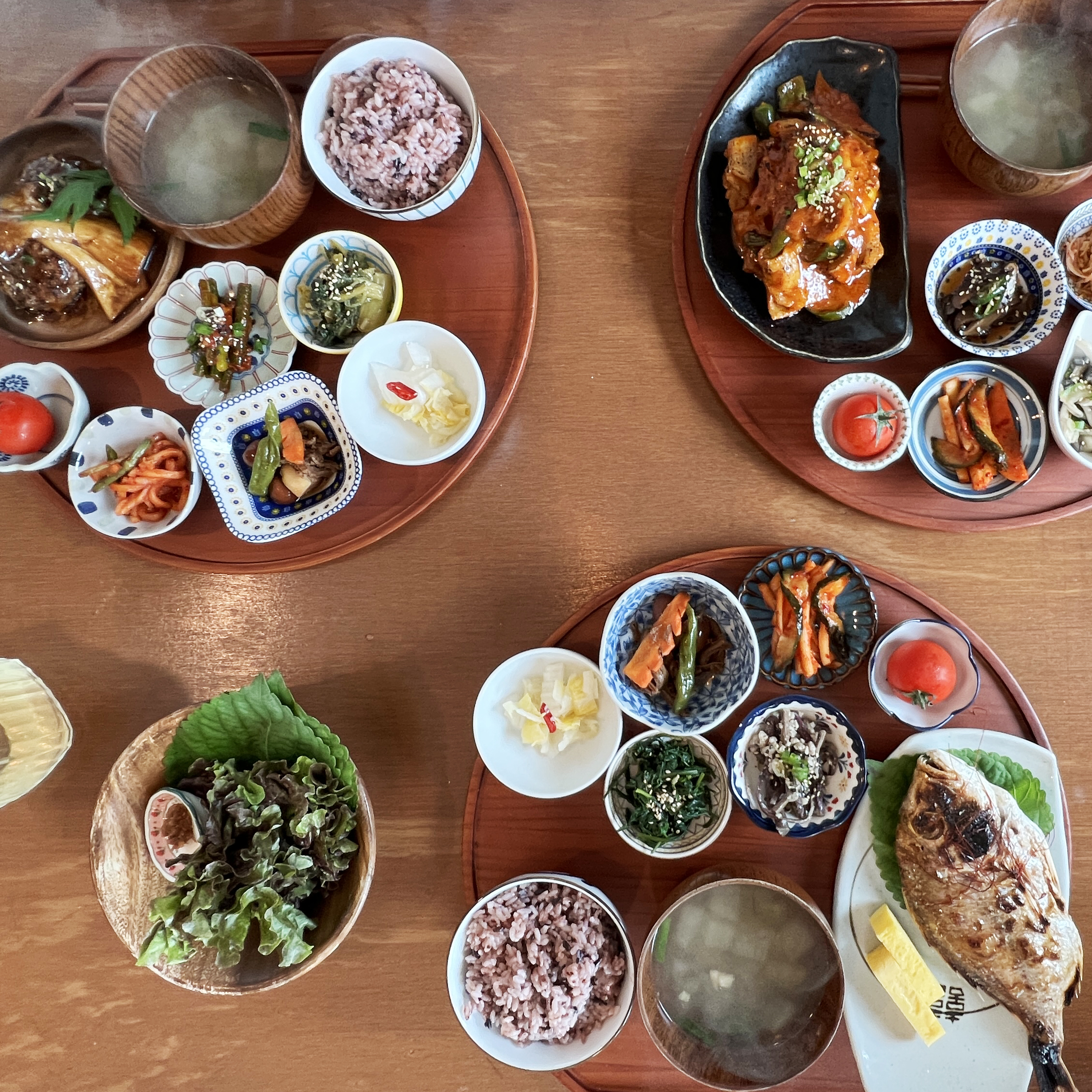 아침부터 비가 퍼붓고 있어 그런지 점심 좀 지나 찾아간 식당은 한가하니 고요했습니다. 창가쪽으로 자리에 앉아 주문을 했습니다. 그리미식당의 메뉴는 딱 3가지 입니다. 제육, 참돔, 떡갈비입니다. 친구와 셋이 가서 각각 하나씩 시켜서 맛을 보기로 했습니다. 원형의 쟁반위에 소담하게 담은 반찬이 앙증맞게 담겨있었습니다. 메뉴별로 반찬은 조금씩 달랐고 작은 그릇들도 모두 제각각 다른 모양을 하고 있었습니다.