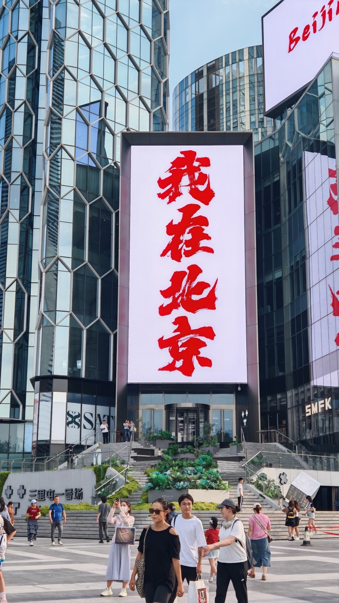 대형 광고영상화면에 잠시 워짜이베이징 문구가 스쳐 지나갑니다. 쓰리허역 부근에 있는 번화가에요.