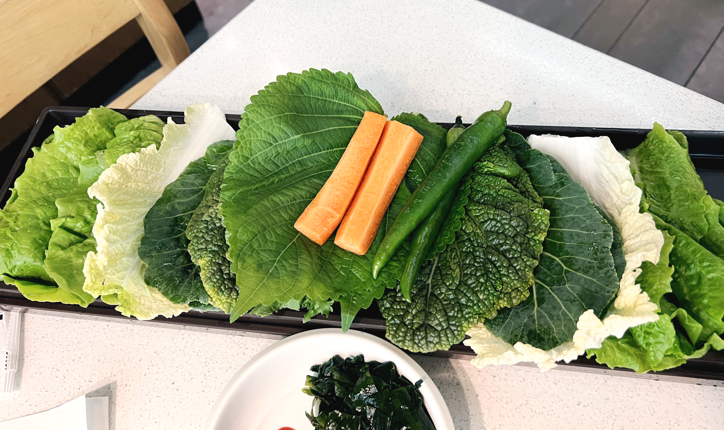 이곳은 제주시 아라지점과 다르게 쌈종류가 좀 다양하지 못한게 아쉬웠습니다. 3인이 식사할 경우에는 양쪽으로 두세트의 쌈을 내주는 아라점과 달리 한세트만 세팅해 준 것도 그렇고 풍성하게 나오던 쌈의 종류도 많이 줄어있었습니다. 요즘 식자재가 많이 올라서일까요? 아무튼 좀 서운한감이 없지않아 있었습니다.