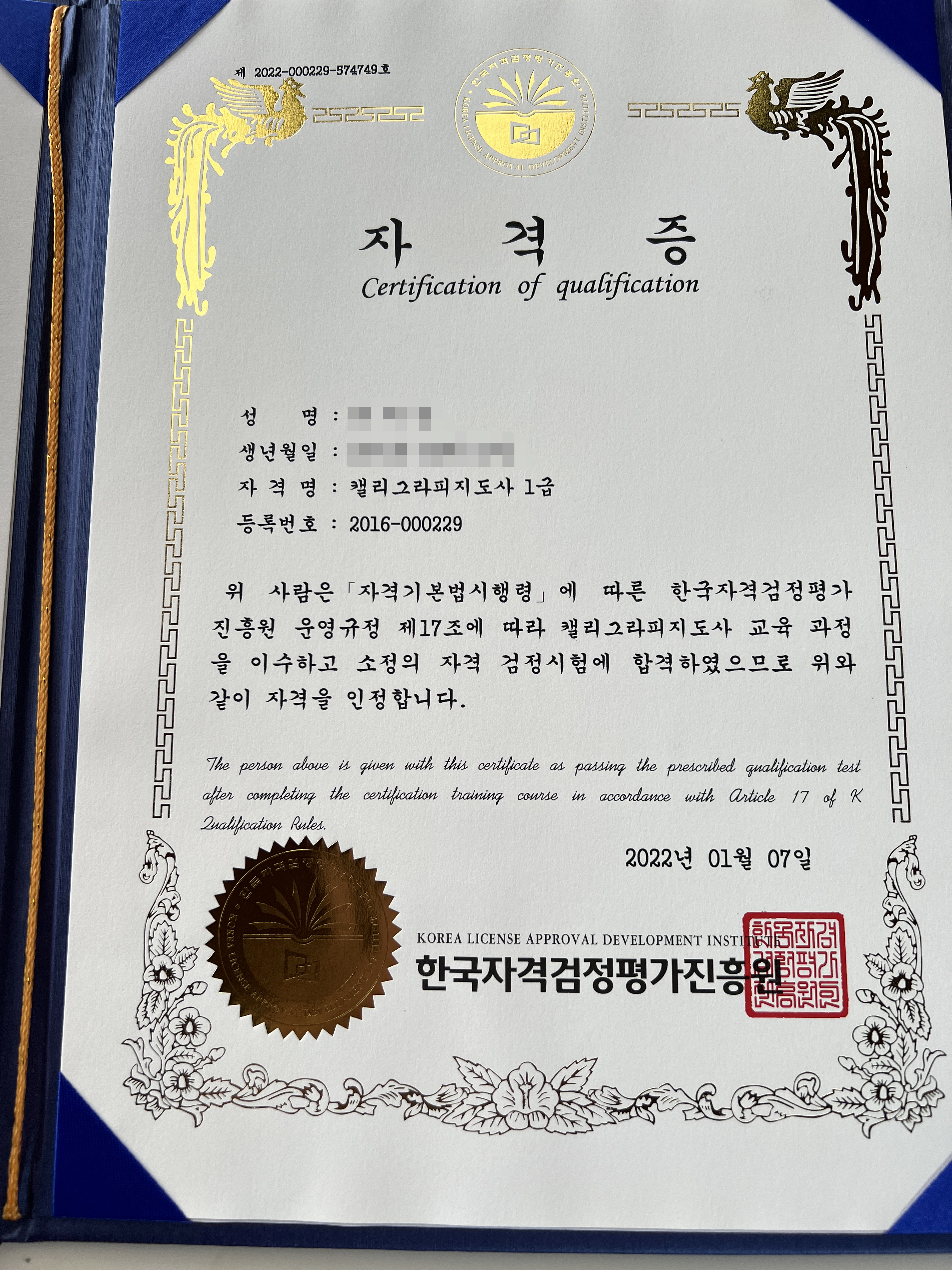 2017년에 캘리그라피지도사 1급 수강을 하고 시험을 보고 합격을 했지만 정작 자격증 발급은 받지 않았습니다. 그러다 올 초에 다시 캘리그라피에 관심을 가지면서 자격증 발급을 신청했습니다. 정작 배울 때는 열심히 배웠지만 연습을 하지 않으니 늘지는 않았습니다.