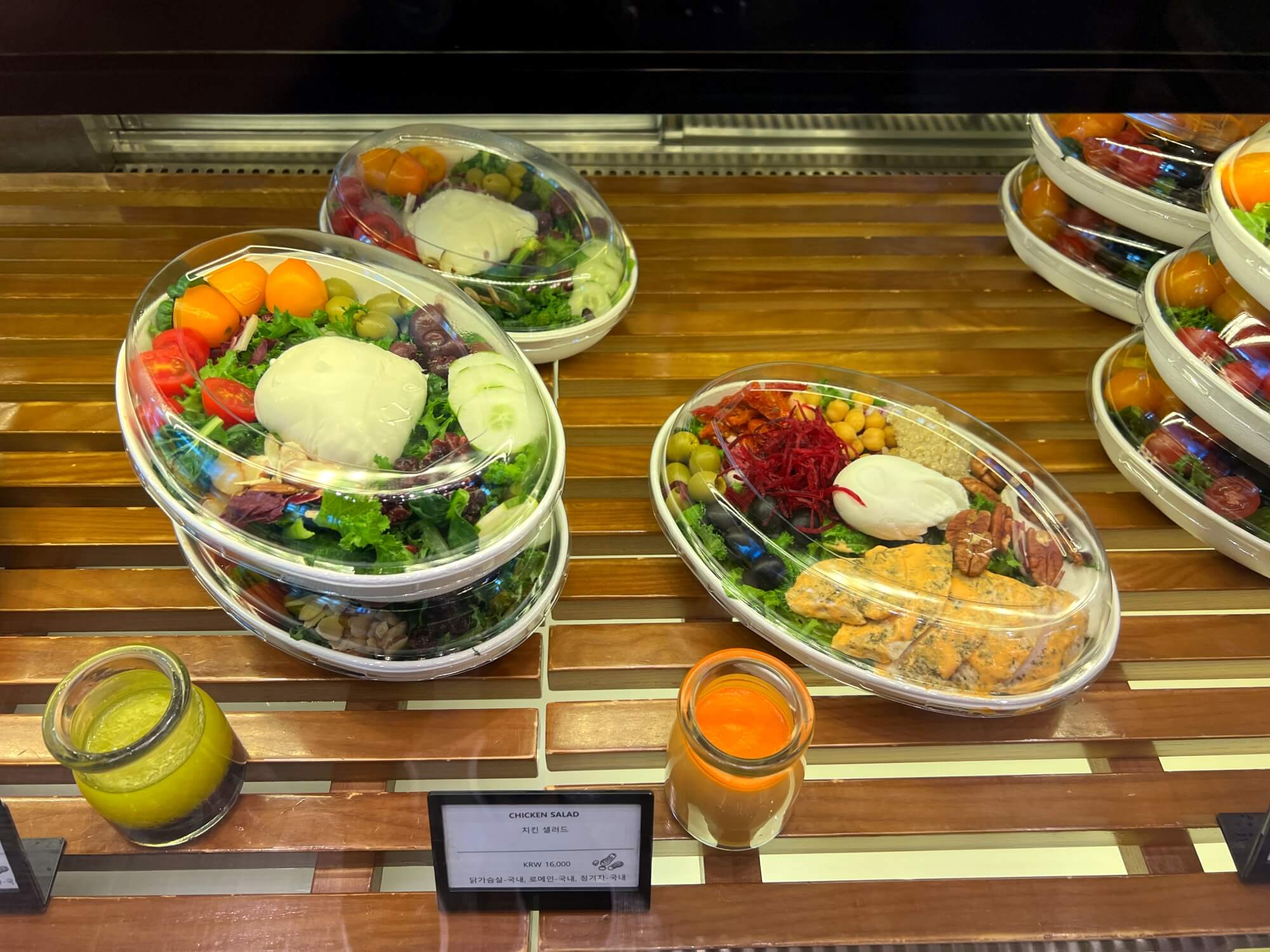 샐러드는 쇼케이스안에 미리 포장이 되있습니다. 그래서 즉석에서 만드는 것이 아니라 신선도는 약간 떨어질 수 있어요. 부라타치즈와 리코타치즈 샐러드도 보이네요. 샐러드 가격이 무려 16,000원 입니다. 한끼 샐러드식사로는 비싼 편이긴 합니다.