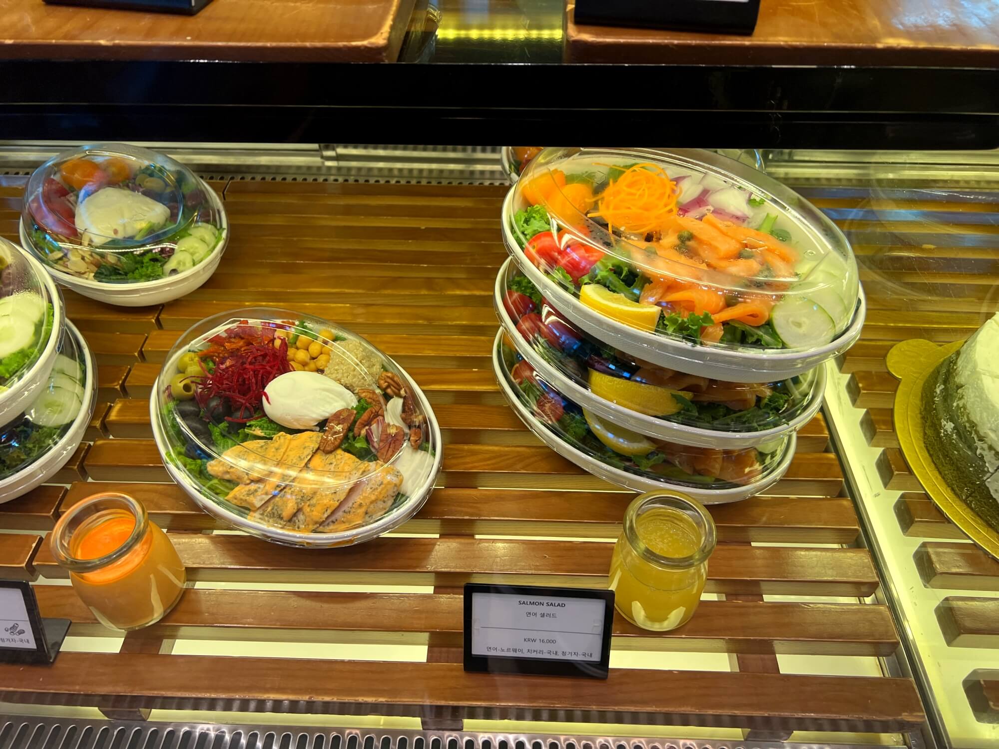 샐러드 외에 조각케익 등이 있어요. 샌드위치도 있고 저녁에 가끔 간단한 식사하고 싶을 때 케익과 커피를 마시곤 합니다. 샌드위치는 맛있었던 것 같아요.