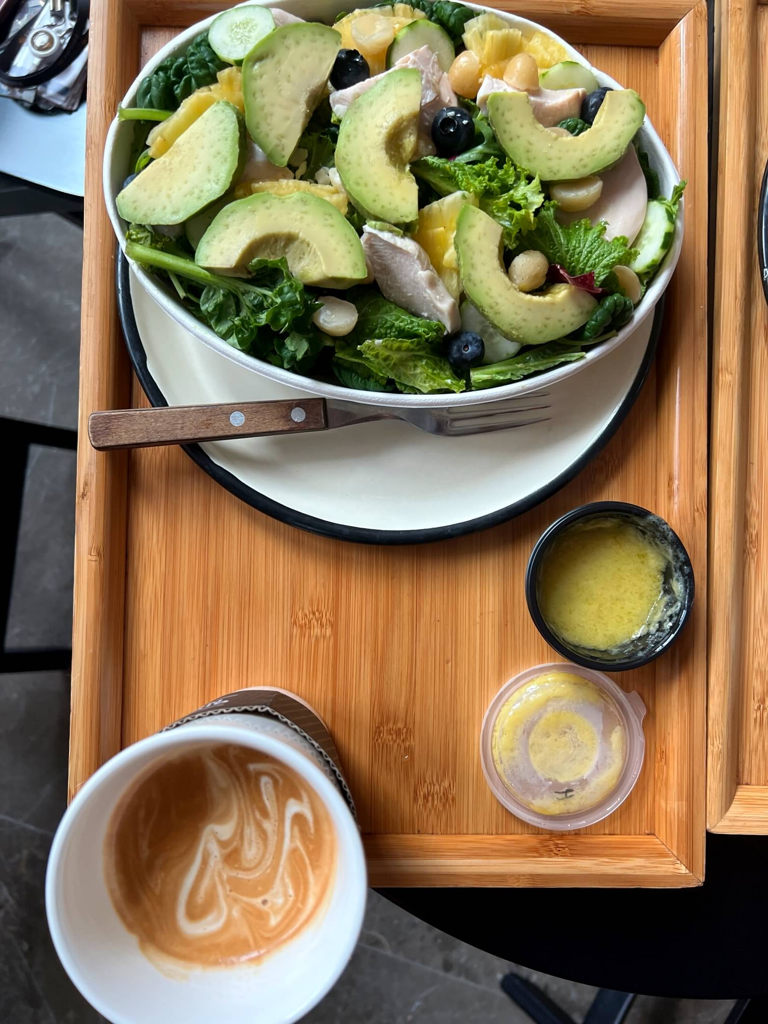 위 메뉴는 닭가슴살 아보카도 샐러드입니다. 닭가슴살은 거의 조미가 되지 않은 그대로의 덩어리인데요, 그래서 그런지 맛이 좀 심심하답니다. 아보카도는 살짝 냉동느낌이 나기도 했어요. 살짝 덜 익어서 풋내가 나기도 했습니다.