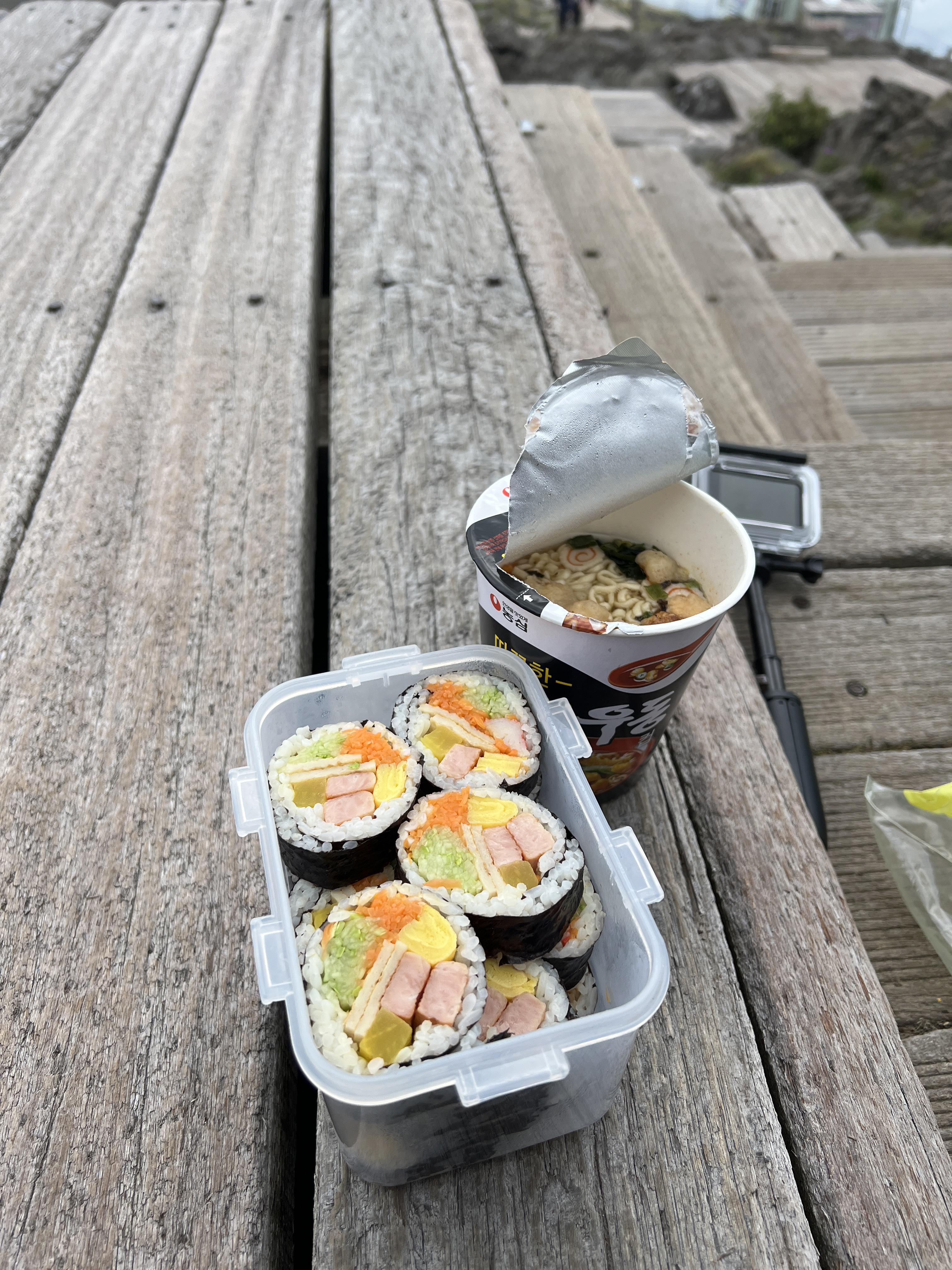 당일 아침에는 김밥을 살 곳이 잘 없으므로 전날 준비해두시는 것이 가장 좋습니다. 성판악 주차장에는 매점이 없습니다. 모든 것을 미리 준비해오셔야 합니다. 대피소 중간 중간에도 매점이 없기 때문에 반드시 먹거리 챙겨가시길 바랍니다. 정말 많이 배고픕니다. 또한 정상에서의 맛을 느껴보세요!