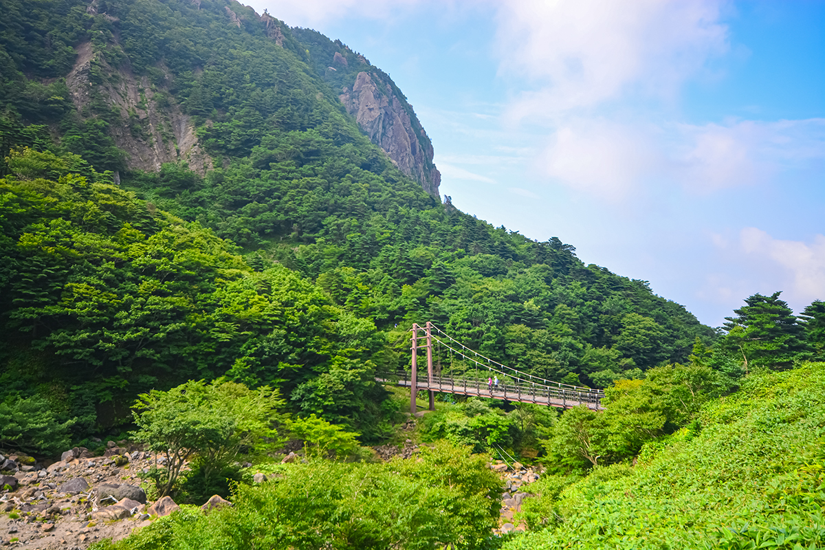 관음사야영장입구에서 시작하여 탐라계곡 등을 거쳐 정상까지 5시간정도 걸립니다. 거리는 짧은데 시간은 더 길죠. 바위가 많고 위험요소가 많아 대부분 이곳으로 올라가는 것을 꺼려합니다. 내려오는 건 그나마 쉬운편이니 주로 내려올 때 선택을 많이 합니다. 저도 오르는 길로 관음사로 시작해 본적은 없습니다. 관음사코스의 최대 장점이라면 멋진 풍경입니다. 이곳으로 와야만 볼 수 있는 왕관릉과 멋진 계곡위의 다리를 건널 수 있답니다. 성판악 코스로 해서 관음사 코스로 내려오실 분들을 위해 참고 사진 몇장 올려봅니다.