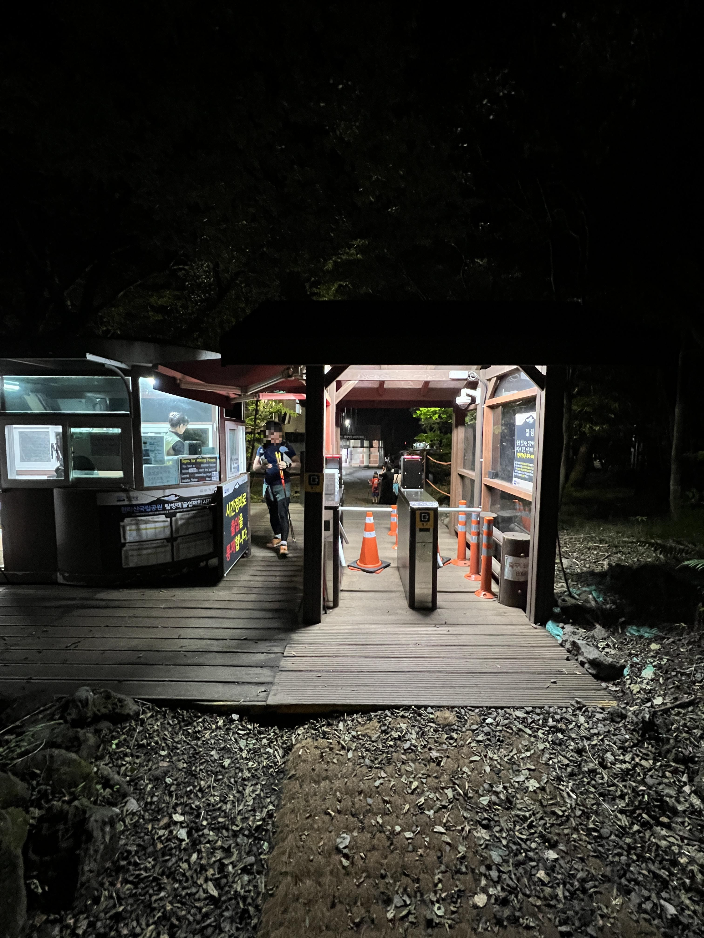 새벽에 올라가보는 건 처음입니다. 저도 준비를 잘 한다고 챙겼지만 헤드랜턴을 미처 챙기지 못해 휴대폰 라이트로 밝히며 올라갔습니다. 큐알코드 반드시 찍어야 하며 그 전에 신분확인 먼저 합니다. 두 분의 안내원이 도와주고 계십니다.