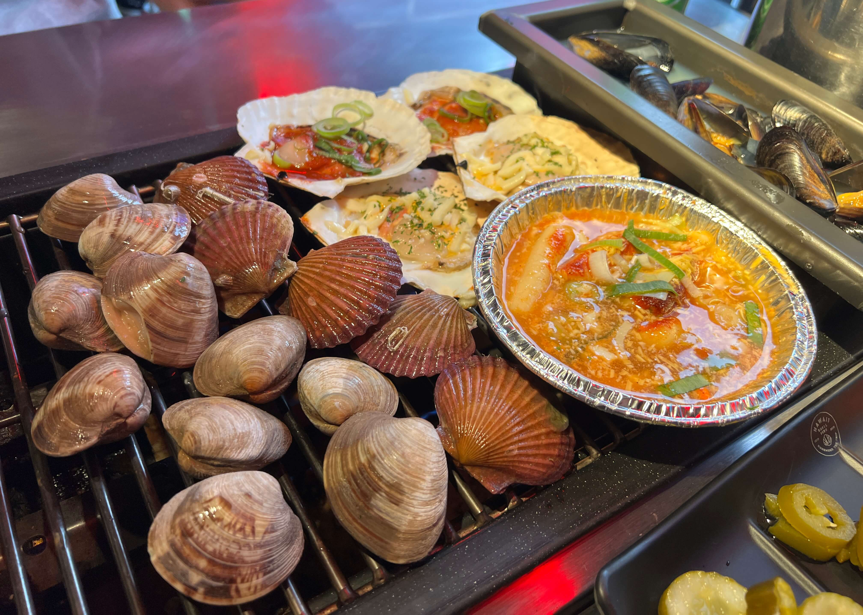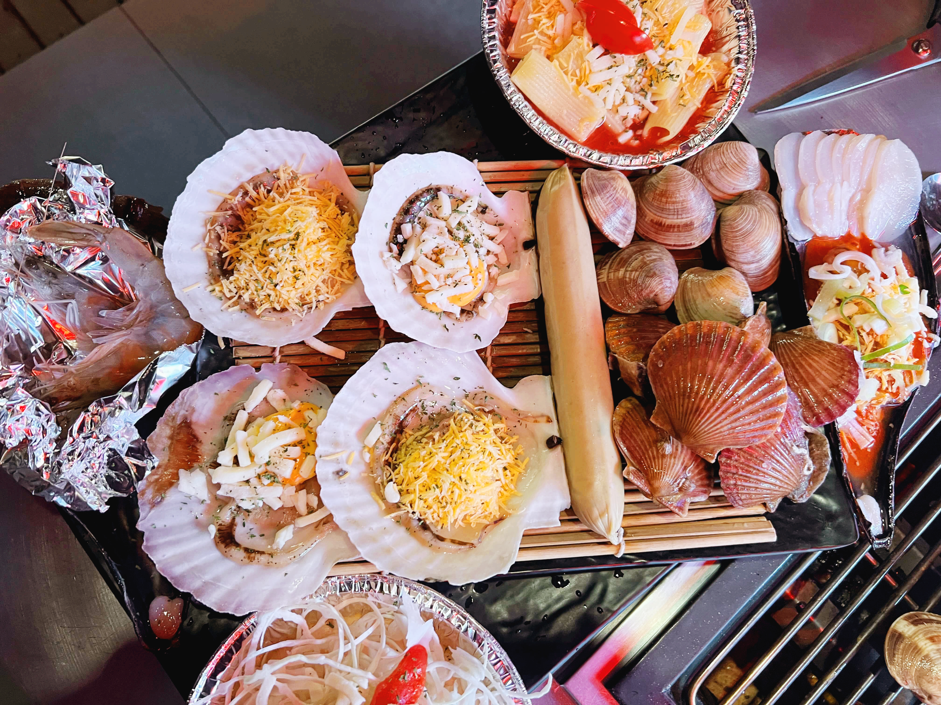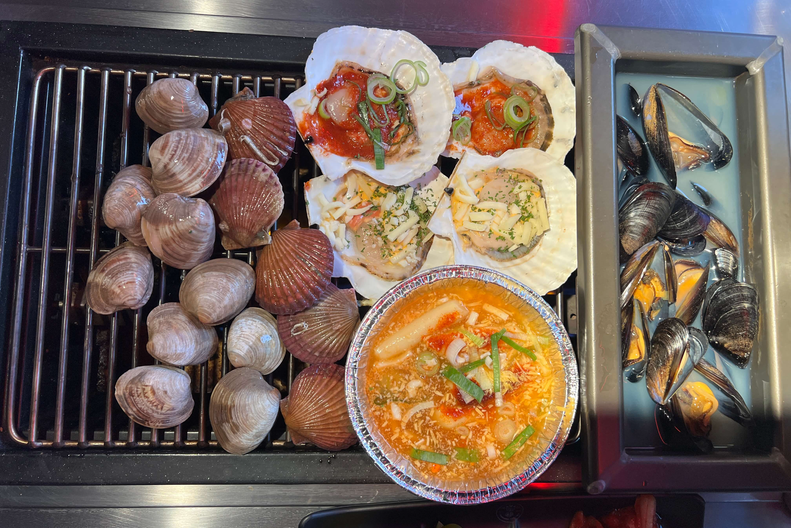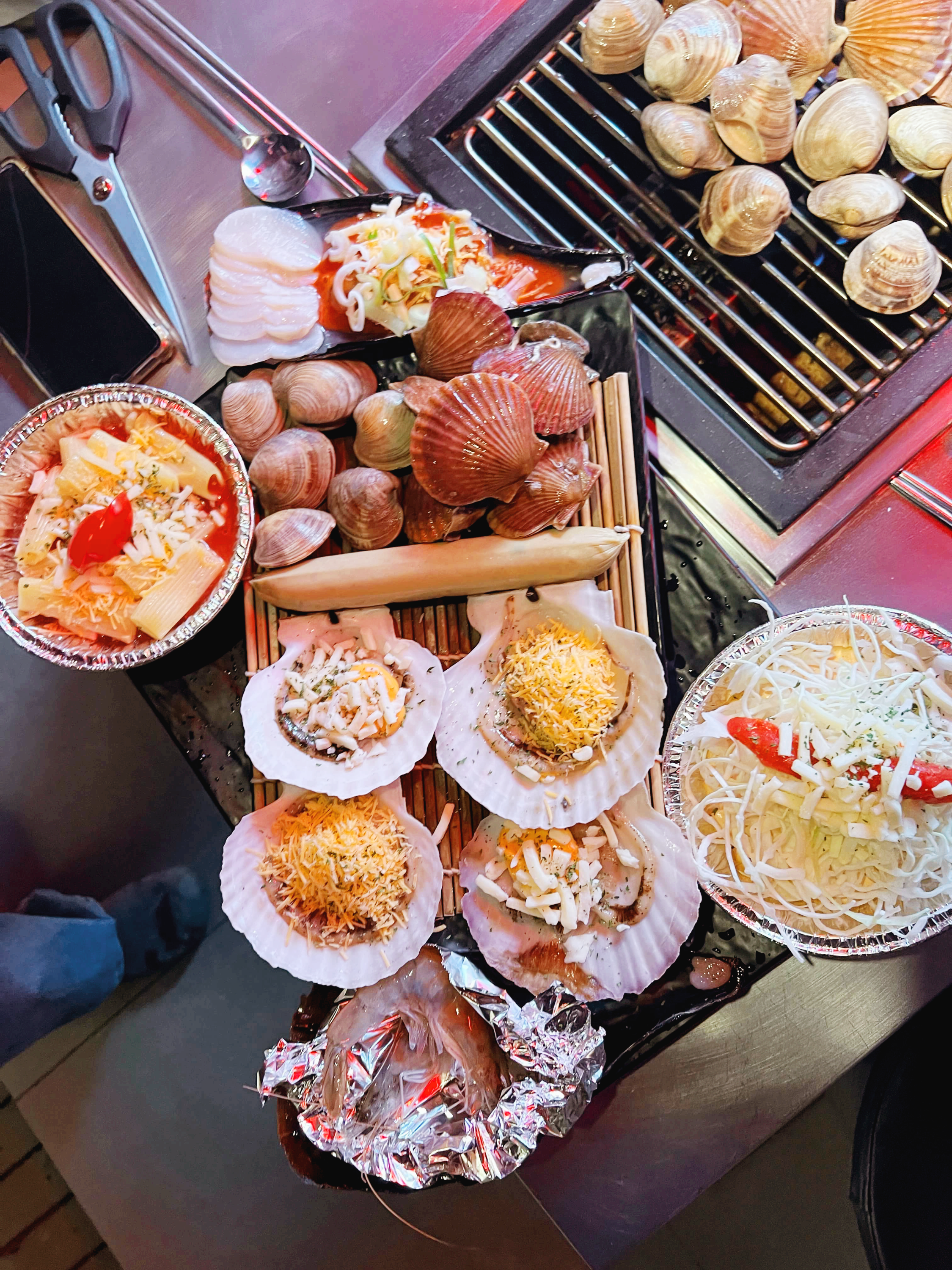 드디어 메인요리가 등장했습니다. 비주얼이 정말 화려하고 먹음직스럽네요. 예전엔 조개구이 하면 그냥 바구니에 조개 가득담아서 줬었는데 요즘엔 이렇게 예쁘게 세팅을 해줘야 사진도 찍을 수 있어 인기인 것 같아요. 조개구이에 키조개가 빠지면 안되겠죠, 키조개 관자를 예쁘게 가지런히 썰어담았네요. 양념된 키조개, 구이용 새우, 치즈가 듬뿍 올라간 가리비, 소세지까지. 둘이서 먹기엔 정말 풍성한 양의 조개구이였습니다.