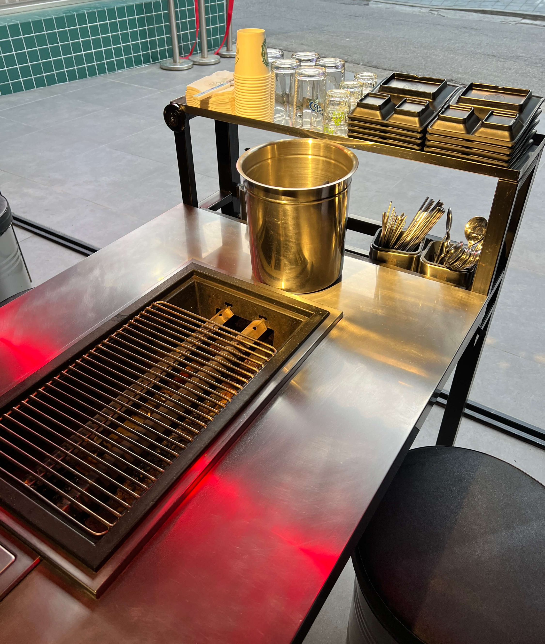 자리에 앉아 테이블 구성을 살펴봤습니다. 연탄이나 숯이 아닌 가스 불로 구워먹는 형태였어요. 테이블마다 기본 도구들이 가지런히 세팅되어 있었습니다. 소주잔, 맥주잔, 앞접시, 수저 등 필요한 것들은 자리에서 바로 바로 해결할 수 있게 되있습니다.