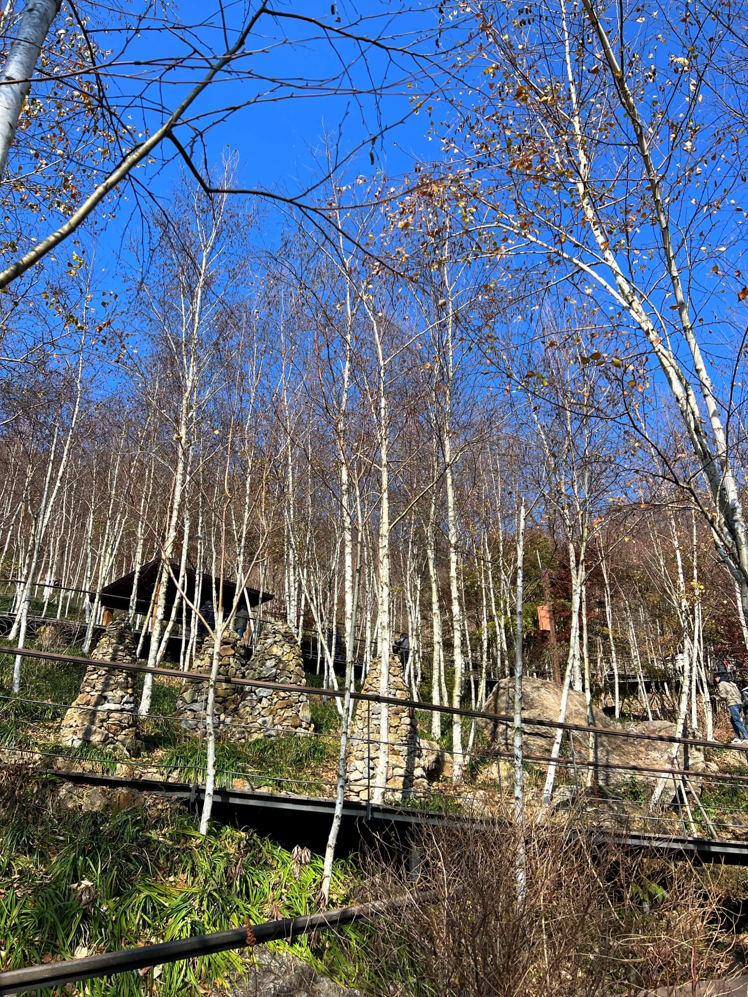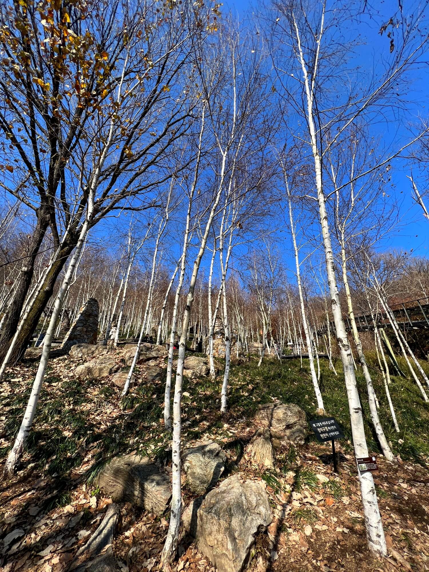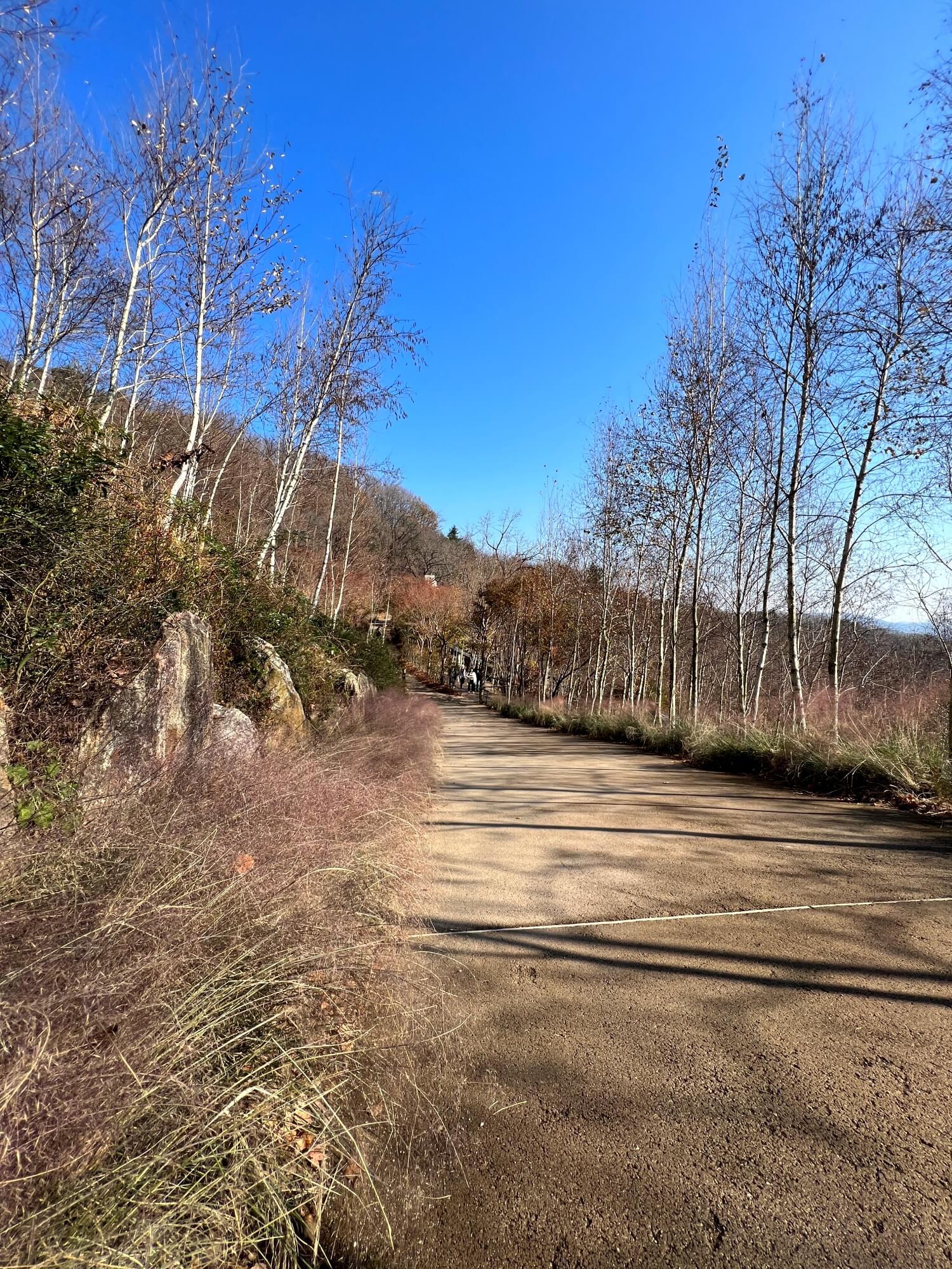 자작나무숲을 이룬 이 군락지에는 온통 자작나무만 있었습니다. 산 위에서 시작되는 화담숲은 산을 잘 가꾼 정원이라 생각하면 될 것 같아요. 산 정상까지 걸어가야 하는 코스이고 가는 길 모두가 예쁜 숲과 계곡으로 이루어져 있어 심심할 틈은 없었습니다. 다만 단풍이 없고 앙상한 나무들만 있어 아쉬울 뿐이었어요.