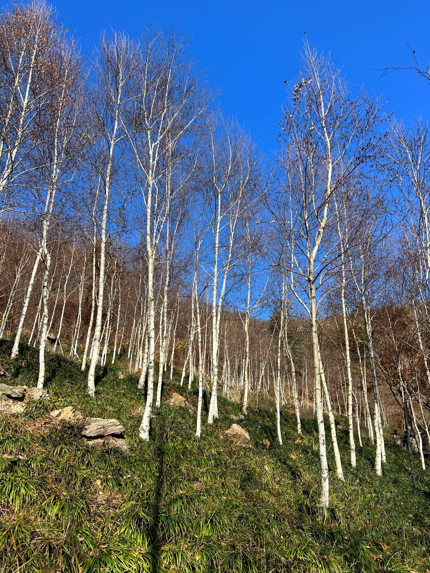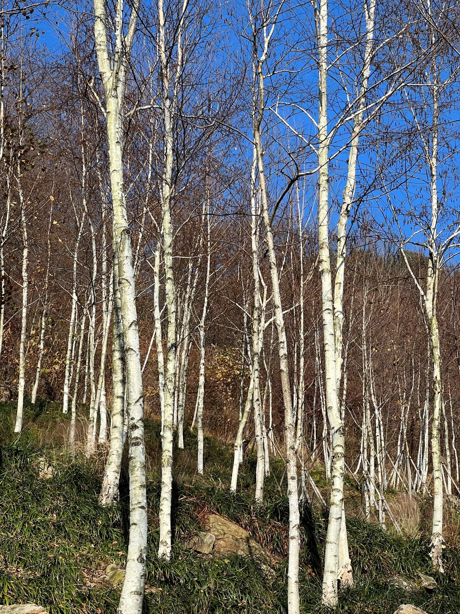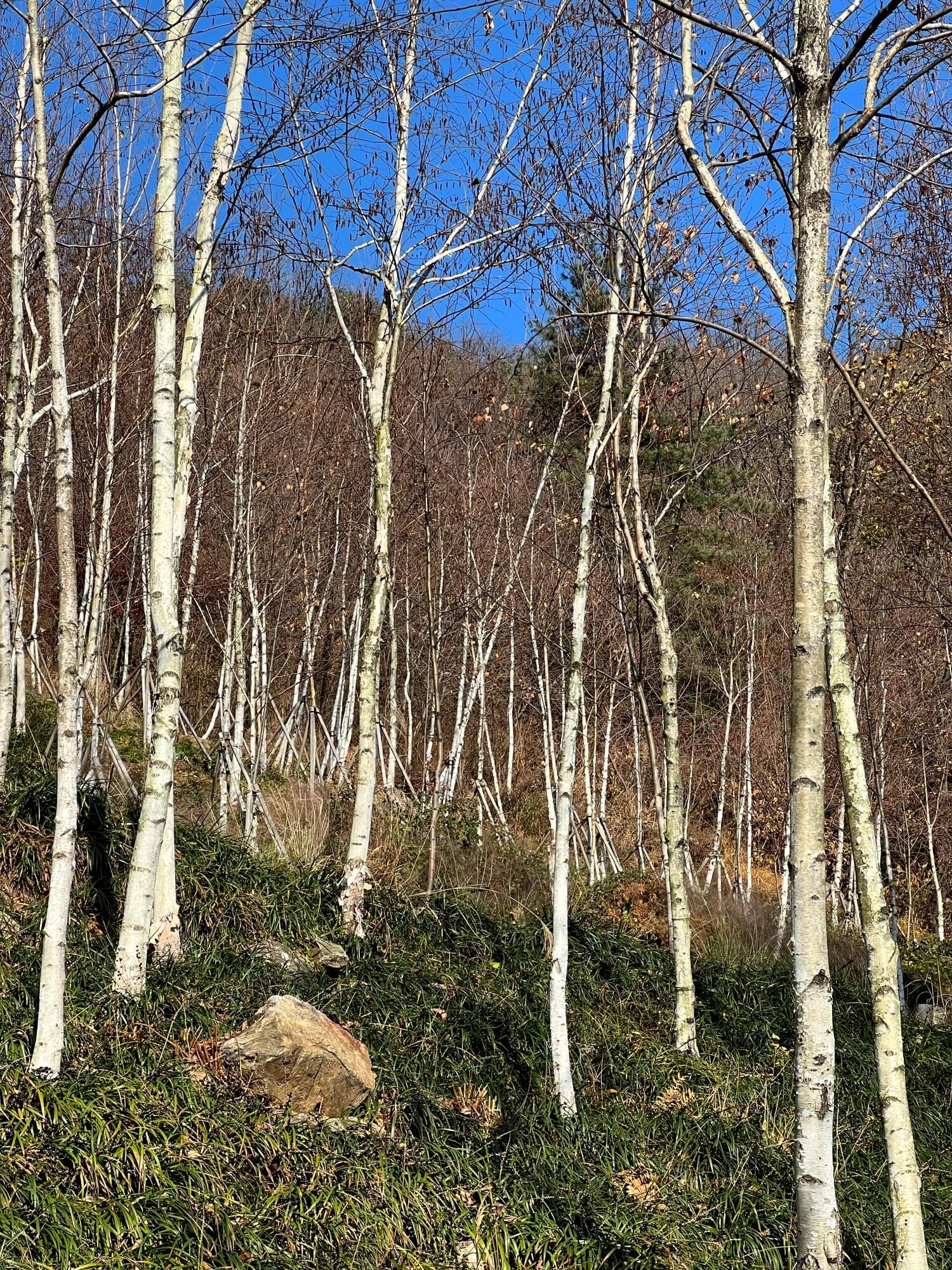 자작나무숲을 이룬 이 군락지에는 온통 자작나무만 있었습니다. 산 위에서 시작되는 화담숲은 산을 잘 가꾼 정원이라 생각하면 될 것 같아요. 산 정상까지 걸어가야 하는 코스이고 가는 길 모두가 예쁜 숲과 계곡으로 이루어져 있어 심심할 틈은 없었습니다. 다만 단풍이 없고 앙상한 나무들만 있어 아쉬울 뿐이었어요.