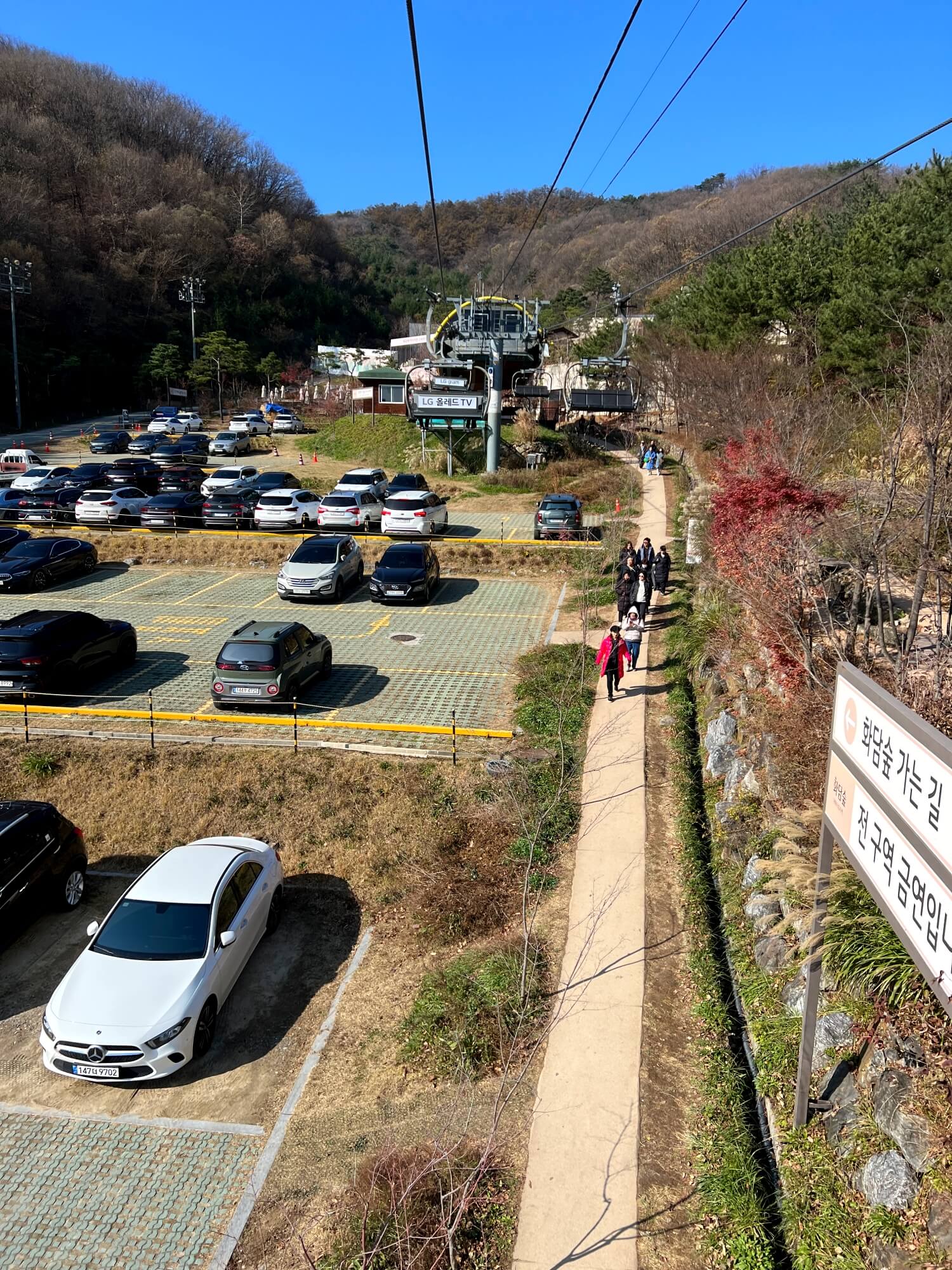 화담숲 주차장 가는 길은 곤지암리조트로 가시면 됩니다. 화담숲과 곤지암리조트가 같은 계열사인듯 합니다. 주차장을 공용으로 사용하고 있었습니다. 초보스키 슬로프하나를 주차장으로 전면 바꾸면서 화담숲 이용자들의 편의시설로 만든듯 했고 이미 그 주차장은 만차여서 저희는 그 아래쪽에 있는 주차장을 이용했습니다.
