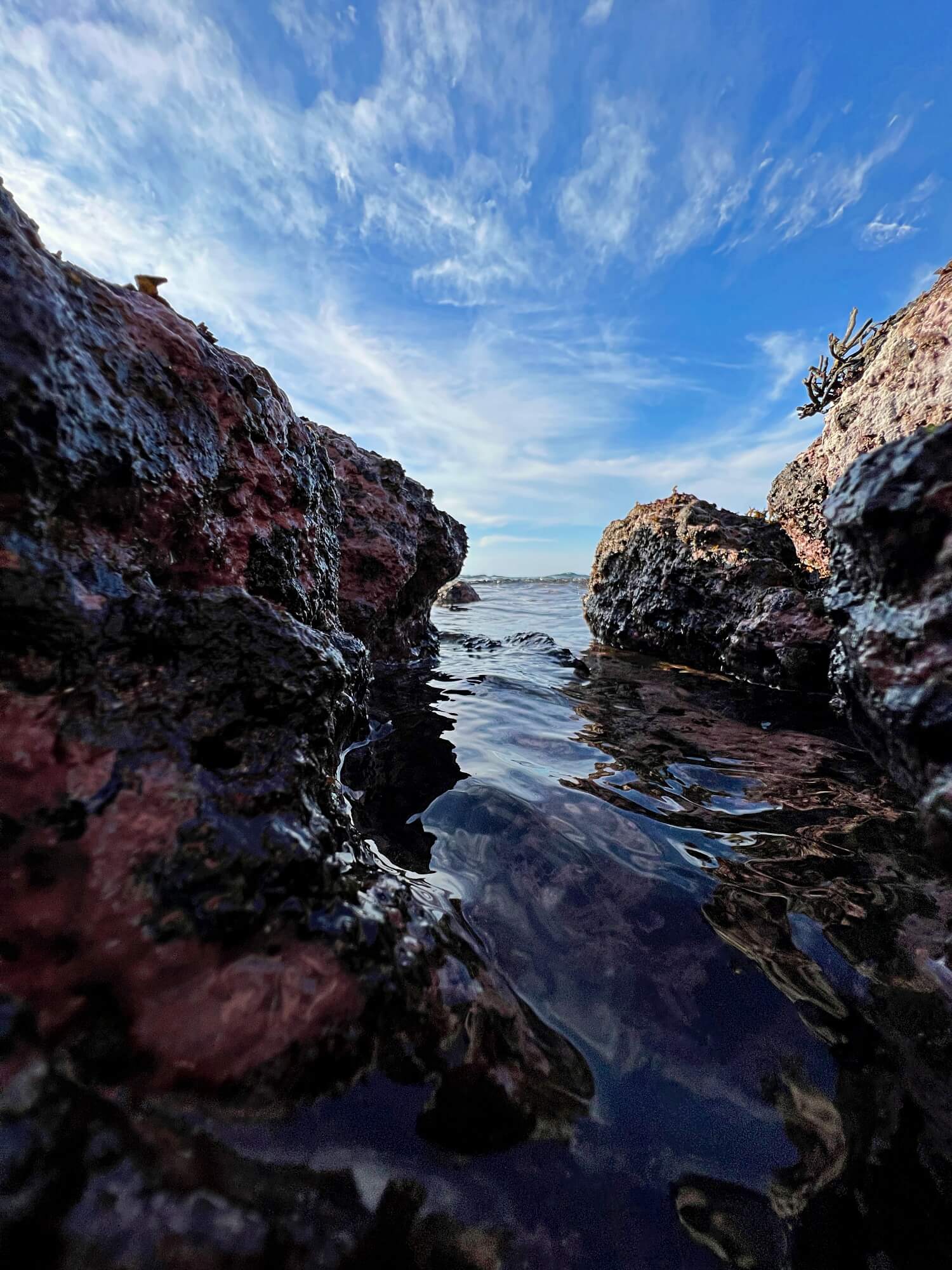 바닷길 제일 끝으로 가면 이끼와 해초들이 자란 바위를 만날 수 있는데요, 바위틈 사이로 물길이 아주 작게 나있습니다. 그곳에 낮게 휴대폰을 드리우고 담아 본 사진입니다.