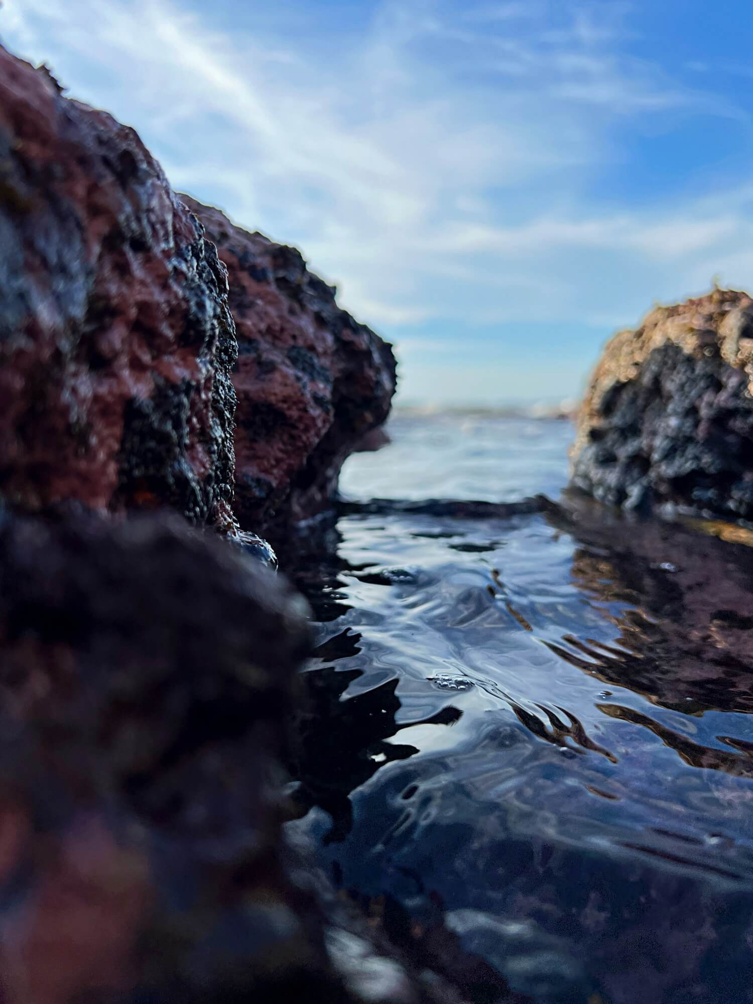 바닷길 제일 끝으로 가면 이끼와 해초들이 자란 바위를 만날 수 있는데요, 바위틈 사이로 물길이 아주 작게 나있습니다. 그곳에 낮게 휴대폰을 드리우고 담아 본 사진입니다.