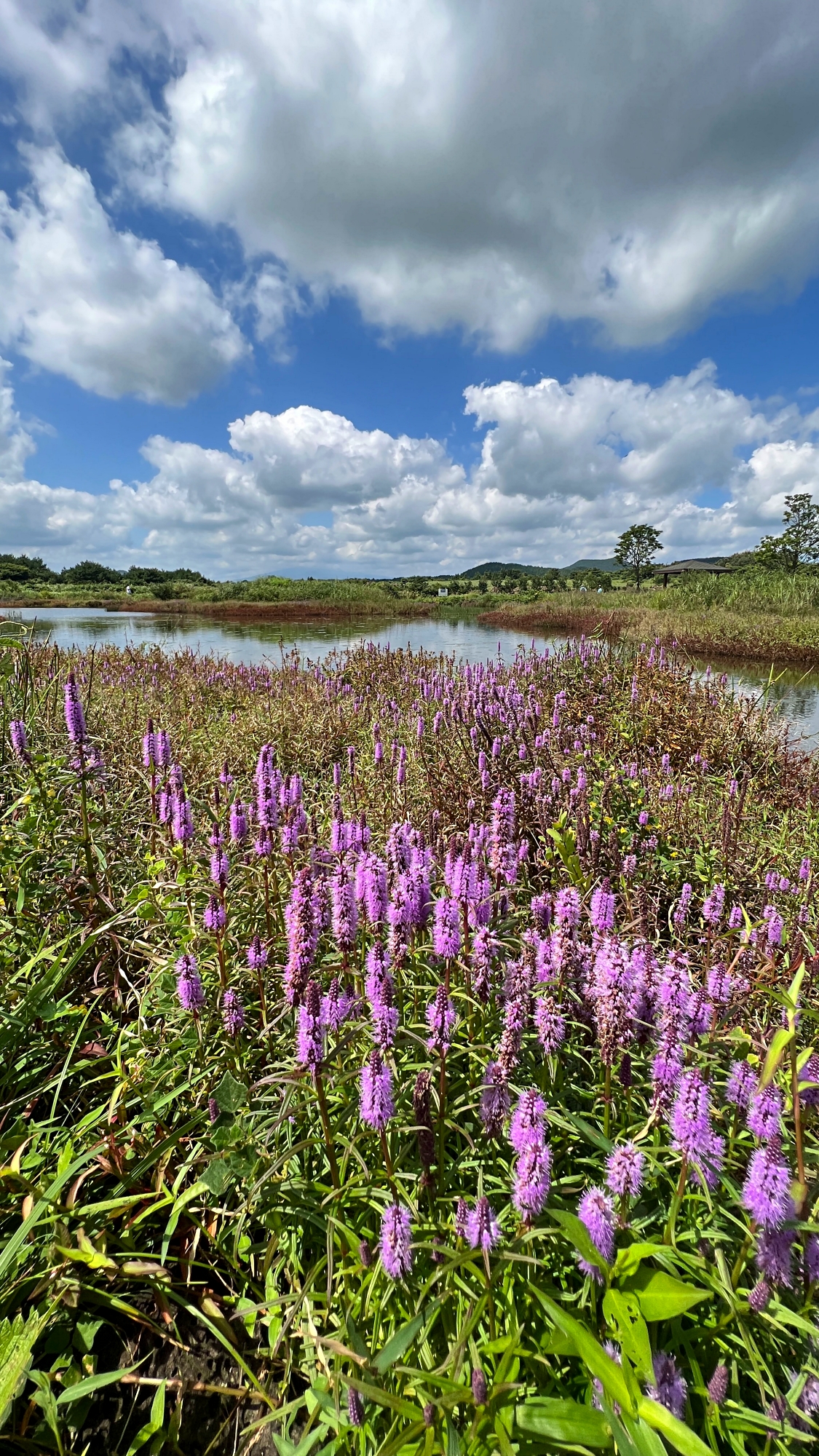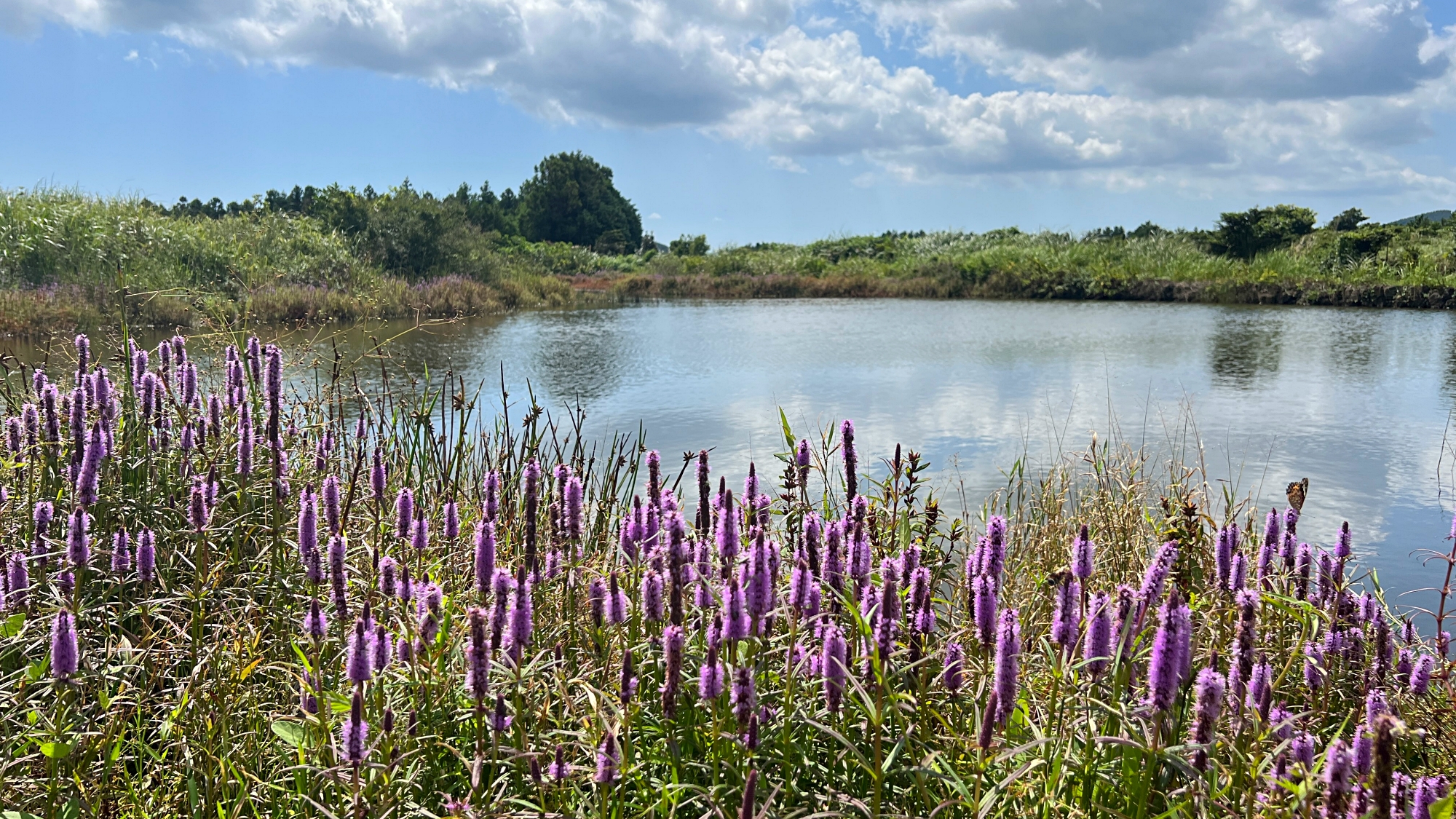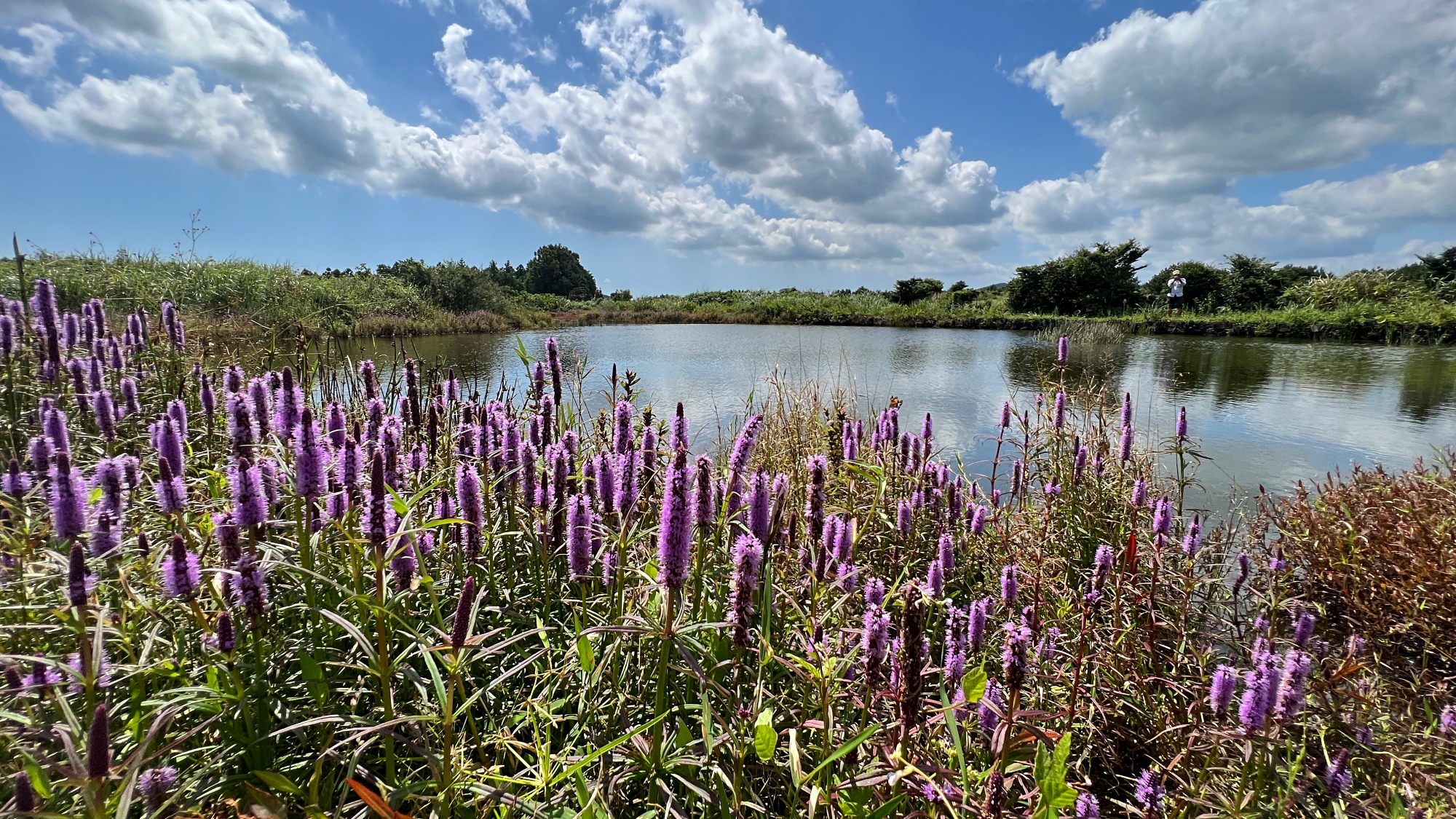 전주물꼬리풀 복원지라고 하는데요. 라벤다같은 보랏빛의 꽃이 자라고 있는데요, 이 풀꽃을 볼 수 있는 계절이 바로 지금입니다. 8월에서 10월까지 피어나는 전주물꼬리풀은 습지에서 자라는 특성을 가지고 있고 지금 현재 이 수산한못에 엄청나게 피어 있습니다.