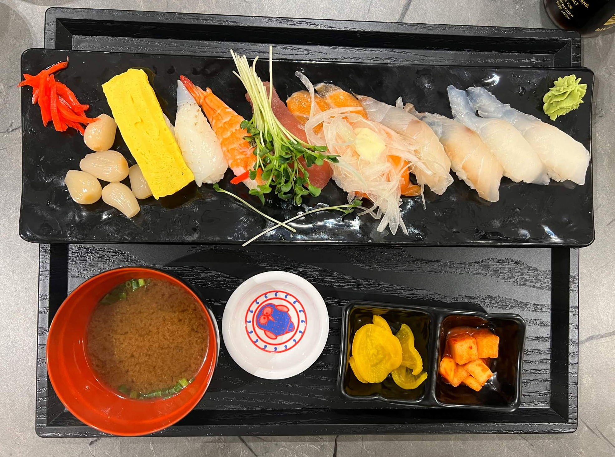 앞 손님들의 메뉴가 한참 나가는 동안 두리번 거리며 먹는 모습을 구경만 하고 있을 때, 드디어 주문한 초밥이 가장 먼저 나왔습니다. 광어, 연어, 참치, 새우, 계란, 한치 등 보기에는 그럴듯한 구성으로 잘 차려져 나왔습니다. 와사비는 내용물 안에는 들어있지 않아요, 별도로 찍어 먹을 수 있게 따로 담아줬네요. 초밥에 있는 밥을 저는 다 먹지 않기 때문에 절반씩만 떼서 먹는 편입니다. 밥양도 그렇게 많지는 않았어요. 사시미의 크기에 맞게 적당한 양의 밥이었습니다.